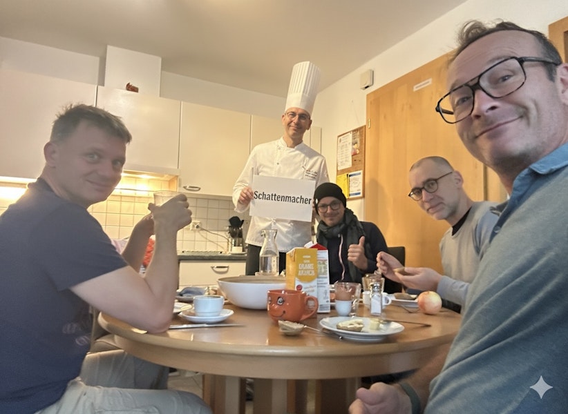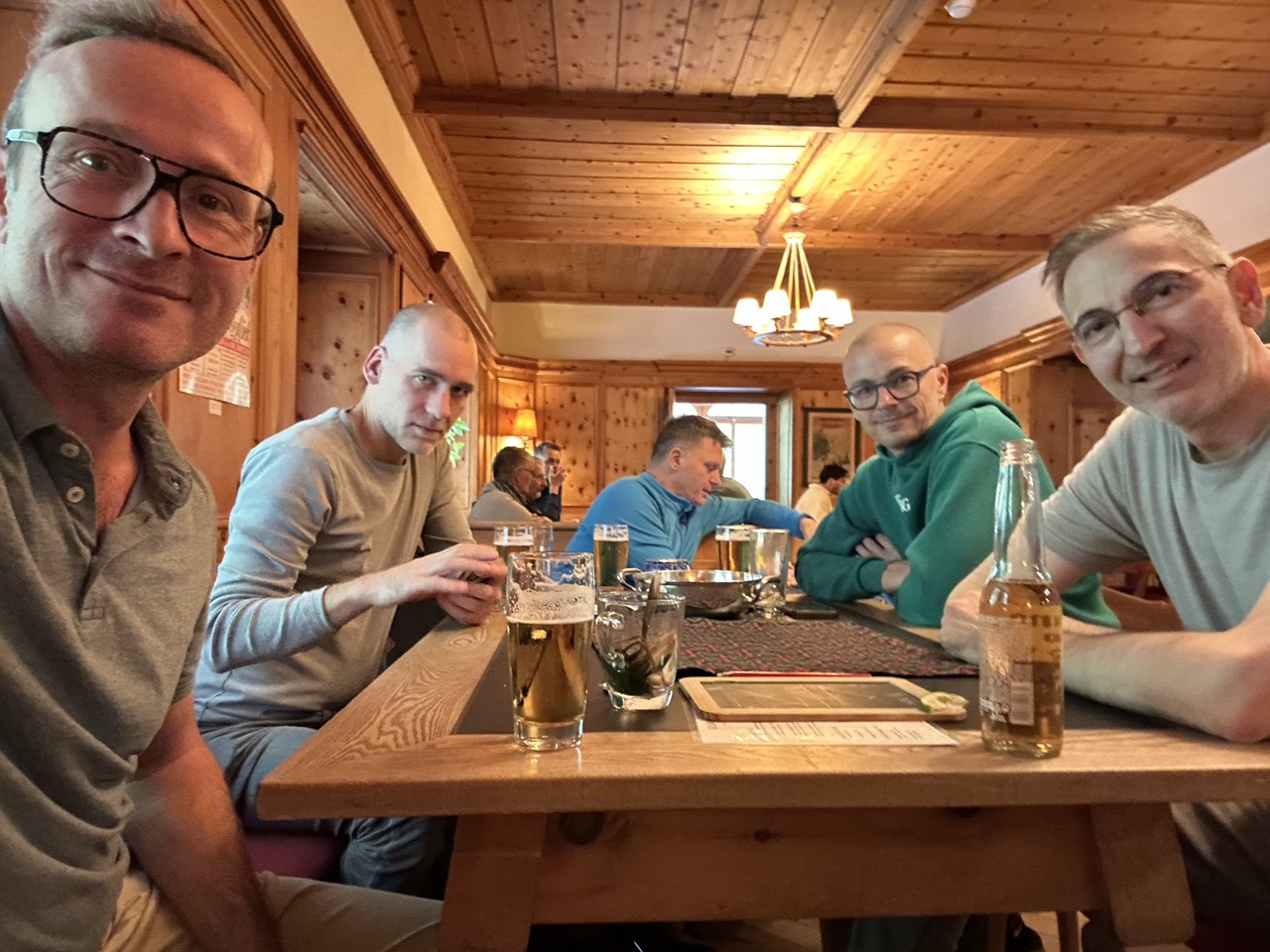 Geprägt vom frischen Unfall Sevis und dem Fernbleiben des Schattenorganisators Hance ergab sich ein bezüglich Kräftebedarfs eher zurückhaltendes Wanderwochenende. Am 1. Tag ging es nach Vna. Im Hotel Val Sinestra traf man auf den per Taxi anreisenden Sevi und eine Hochzeitsgesellschaft. Zu Fuss ging es nach ausführlichem Jass weiter bis Sent. Übernachtet haben wir in einer Airbnb-Wohnung in der Kellerwohnung eines Familienhauses. Am nächsten Tag ging es ins Bogn Engiadina, Bad und Sauna.